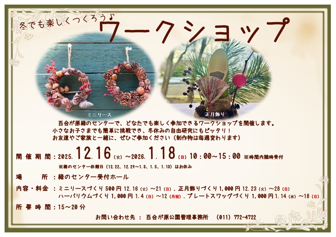 - 申し込み、お問い合わせ:2025年12月11日 木曜日 8時45分から 百合が原緑のセンター受付窓口に直接か、お電話(011)772-3511でも承ります。