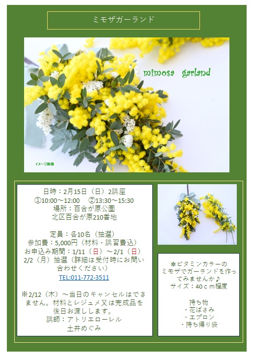 2月といえば百合が原 緑のセンター温室のシンボルツリー「ミモザ」が見頃を迎える季節。ビタミンカラーのフレッシュなミモザだけでなく、明るい色合いのスターチスなども使って仕上げる、ミモザのアレンジメント講習会です。アトリエローレルの土井めぐみさんを講師に招いて、今年はガーランドを製作します。