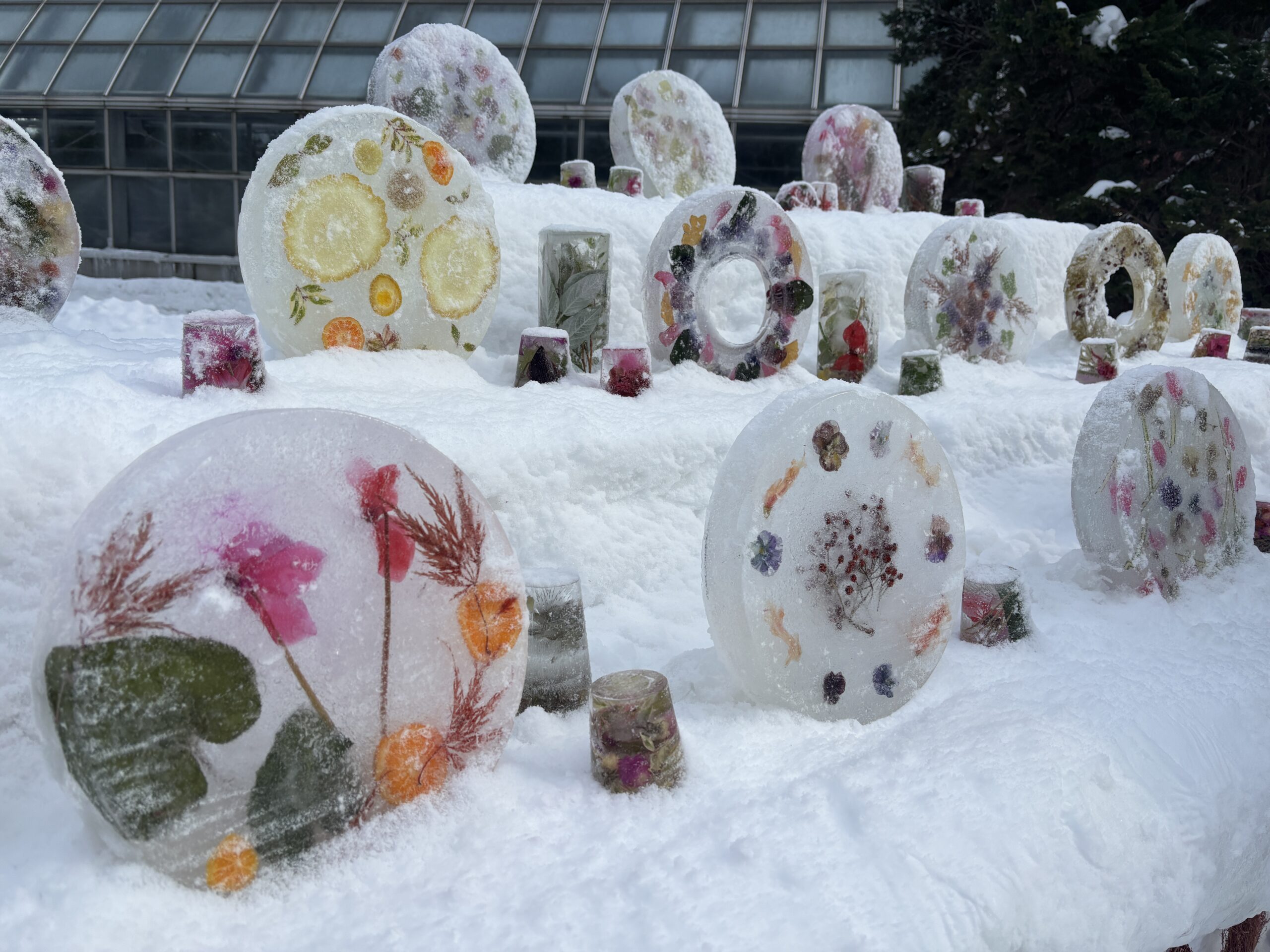 百合が原公園 冬のイベントといえば、植物を使った氷板や氷中花を展示する【アイスキャンドルの点灯】。今年も本日1月20日 火曜日から25日日曜日の期間開催します。