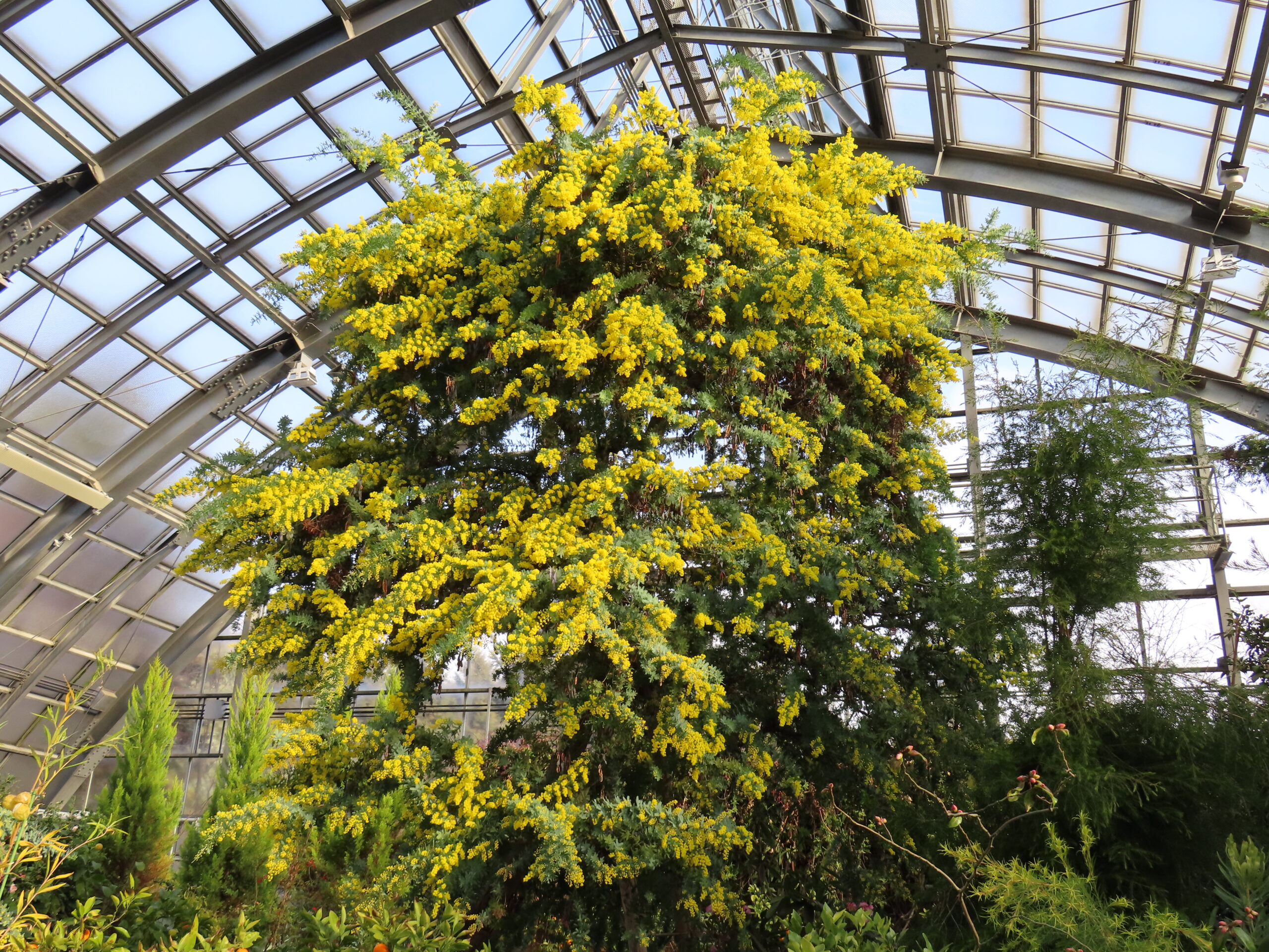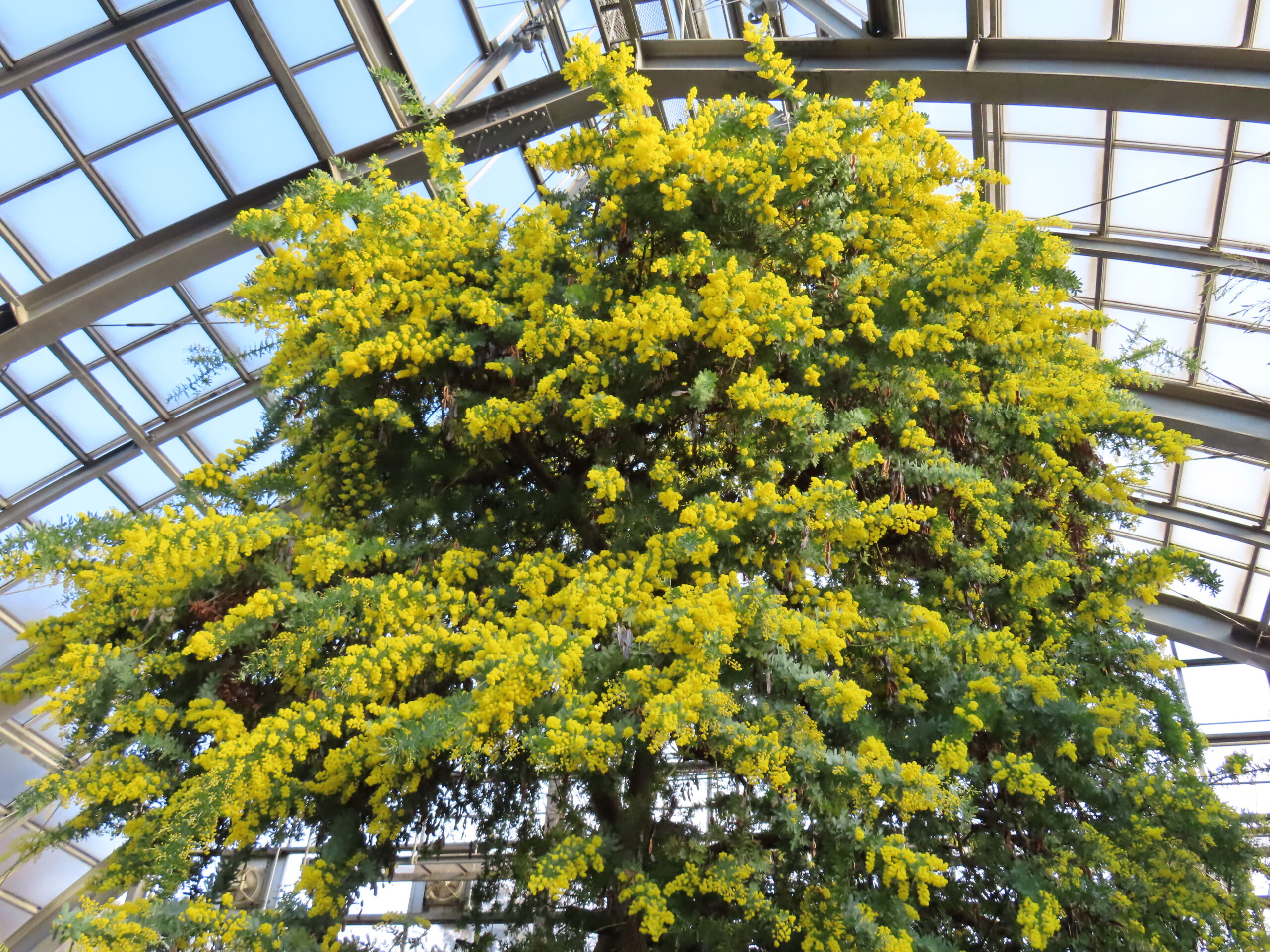百合が原緑のセンター大温室では、澄みきった青空に映えるミモザ(ギンヨウアカシア)の鮮やかな黄色が、ひと足早い春の訪れを感じさせてくれます。