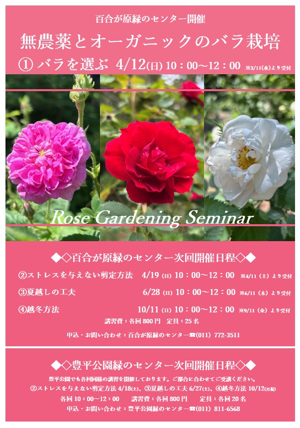 ※4月19日 日曜日には【無農薬とオーガニックのバラ栽培2「ストレスを与えない剪定方法」】も開催されます(こちらの申込みは4月11日 土曜日から)。