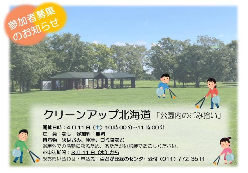 私たちの北海道を私たちの手で、世界一きれいな場所にしよう!を合言葉に、四季折々の植物が楽しめる公園「百合が原公園」のクリーンアップにみなさまも参加してみませんか?