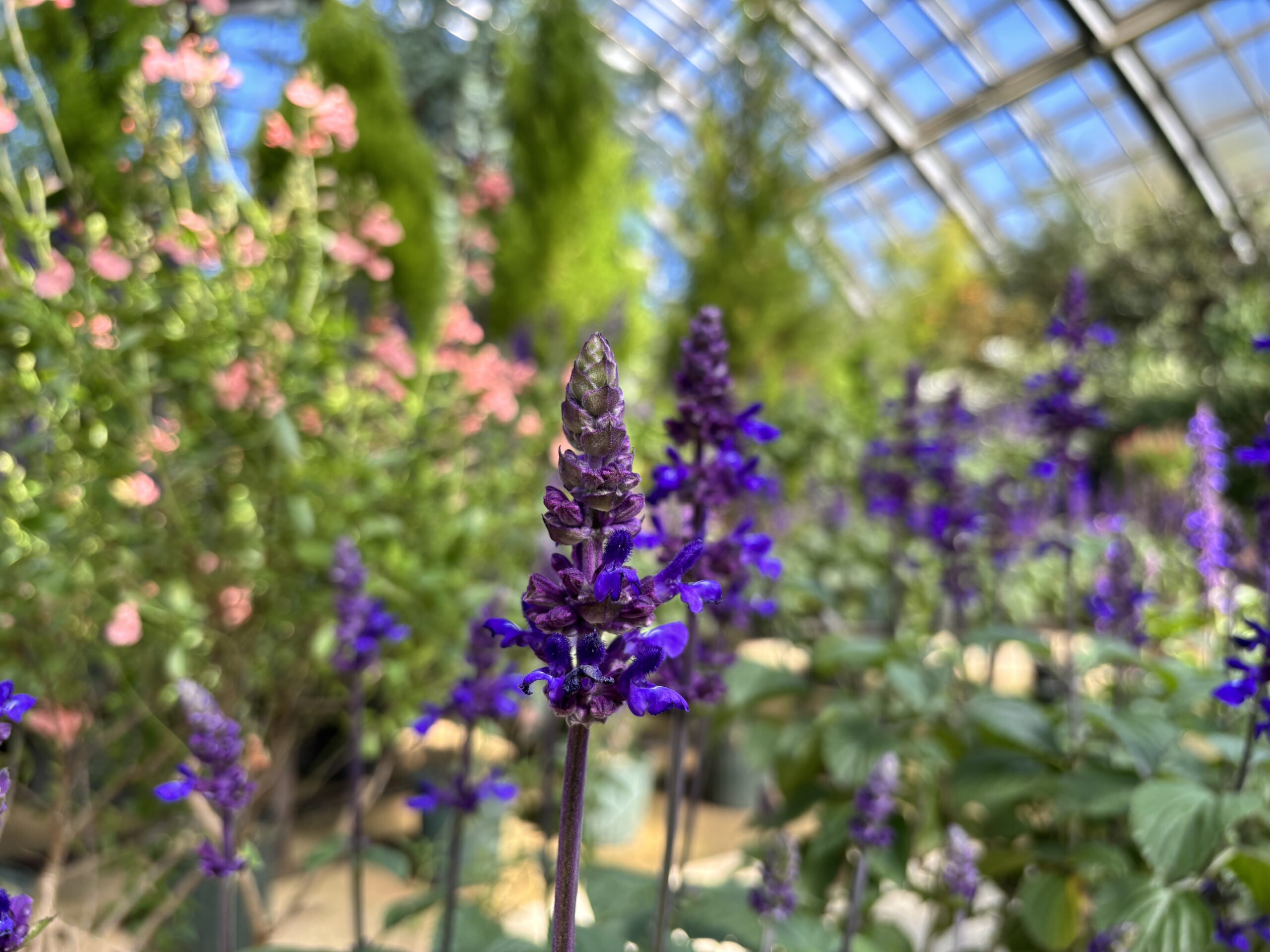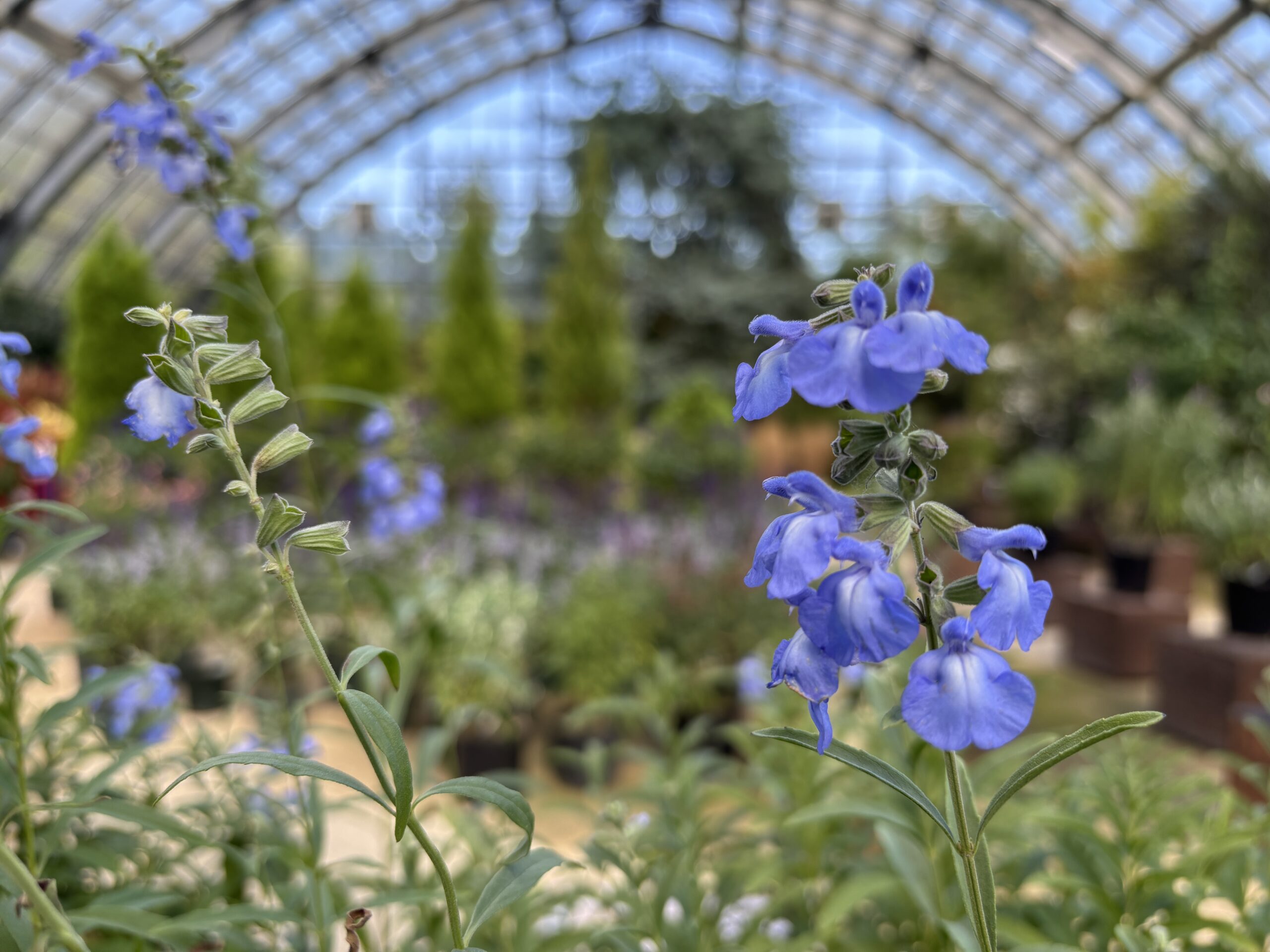 会場中央には、今回初めて展示するサルビア ‘ビッグブルー’と‘ブルーチル’を並べ、そこを渡るように通路もつくりました。サルビアに囲まれて写真を撮れるよう鉢を配置していますので、ご来館の際は記念撮影もお楽しみください。