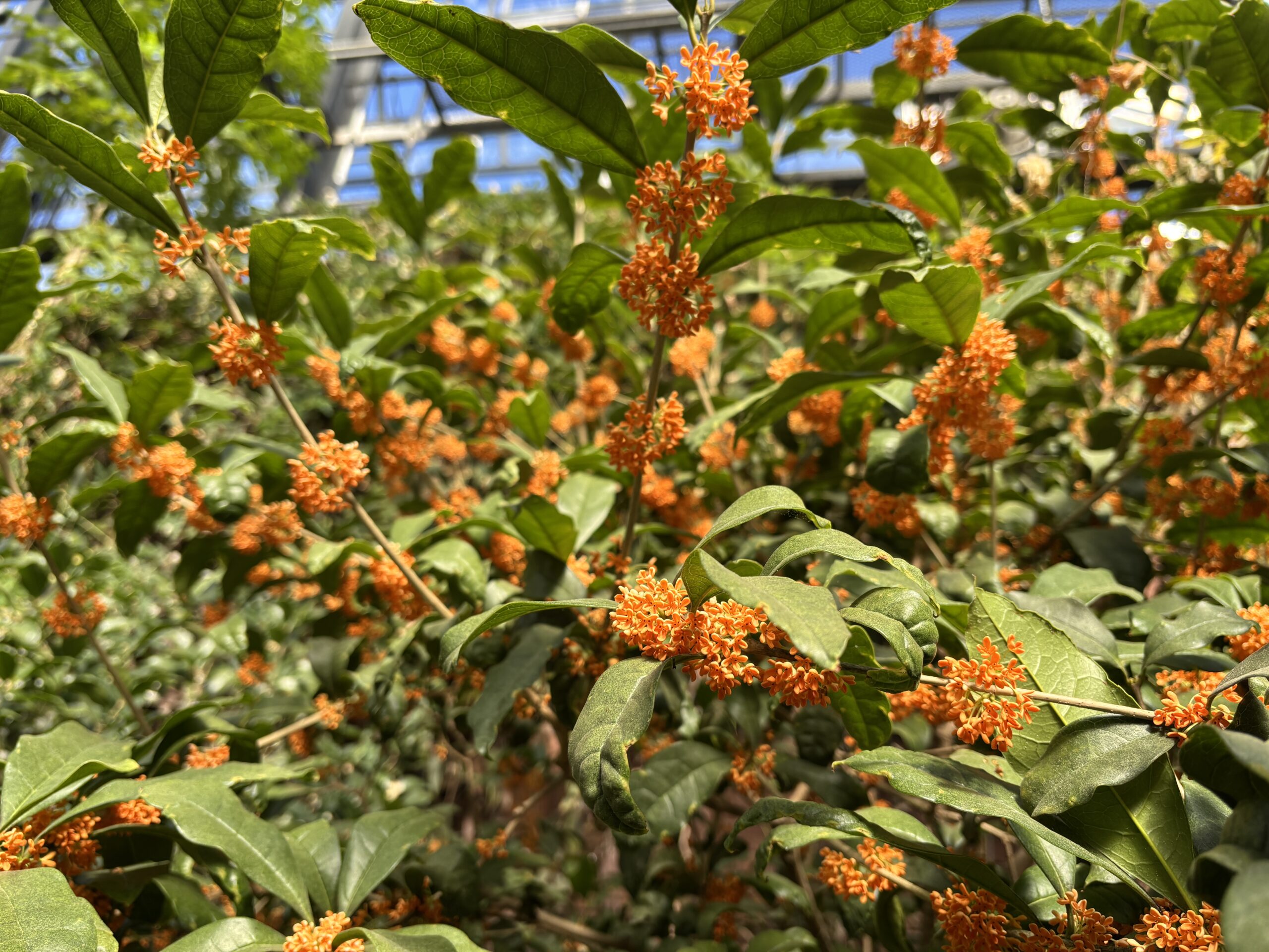 また、同じ会場のキンモクセイとヒイラギモクセイは、例年にないほど花を咲かせて見頃を迎えています。ただ、芳香が弱まってきていますので、今年まだご覧いただけていないみなさまはお早めにお越しください。