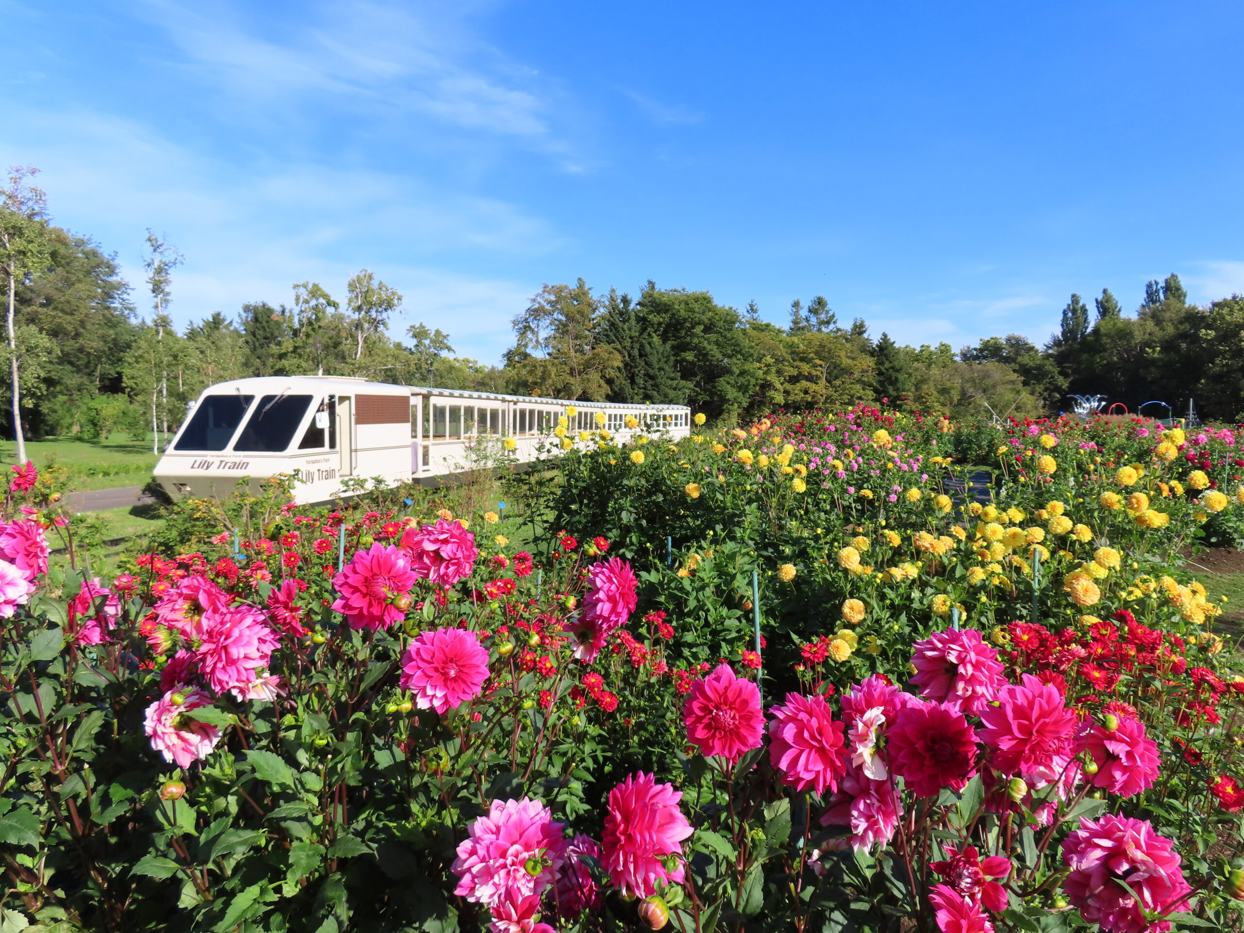 公園内を1周12分で周遊する人気の乗り物「リリートレイン」。10月は土日祝日のみの運行となりますが、最終運行日の10月26日 日曜日まで車窓からは満開のダリアがご覧いただけます。現在、コスモスやムクゲなども沿線を飾ります。