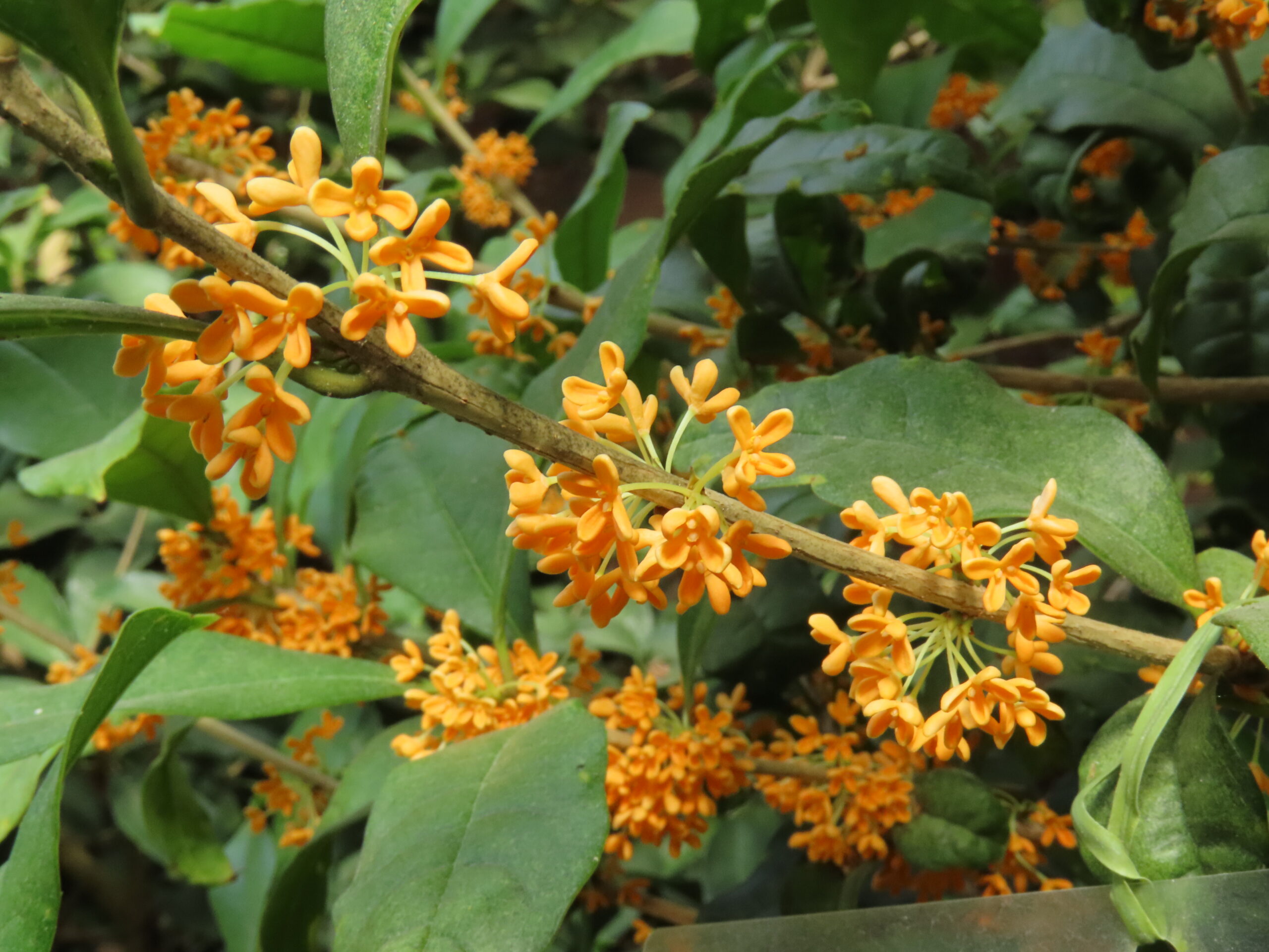 キンモクセイやギンモクセイ、ウスギモクセイは大温室奥の板壁前に植栽され、甘い香り広がってます。