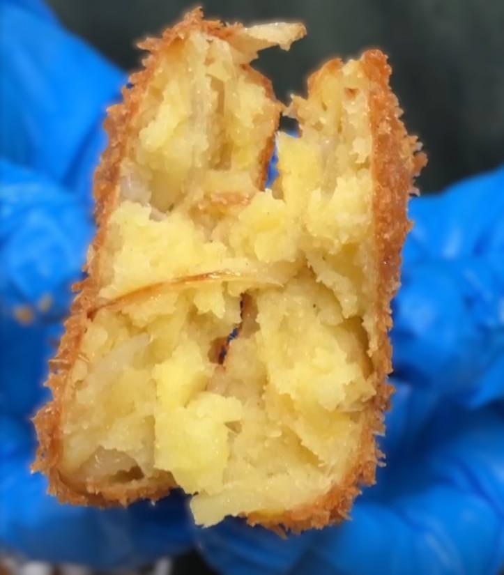 近隣の農家さんで採れたジャガイモ「とうや」と新たまねぎをたっぷり使った「百合たまコロッケ(250円)」。たまねぎのジャガイモの優しい甘味がお口いっぱいに広がります。ぜひご賞味ください!
