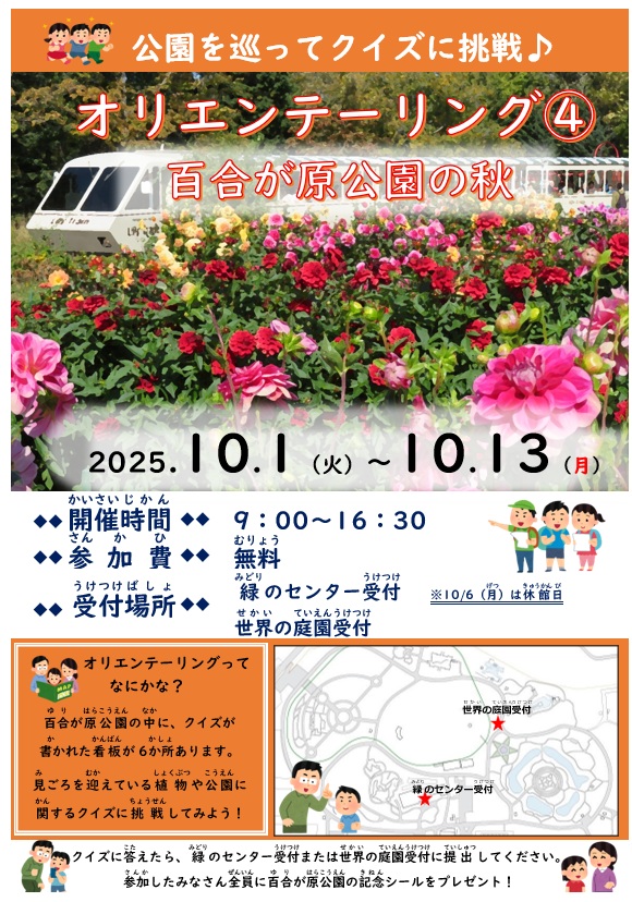 また、本日からは、園内を散策しながら季節の植物や百合が原公園を題材にしたクイズに無料で参加できる「オリエンテーリング4~百合が原公園の秋~」も開催中。