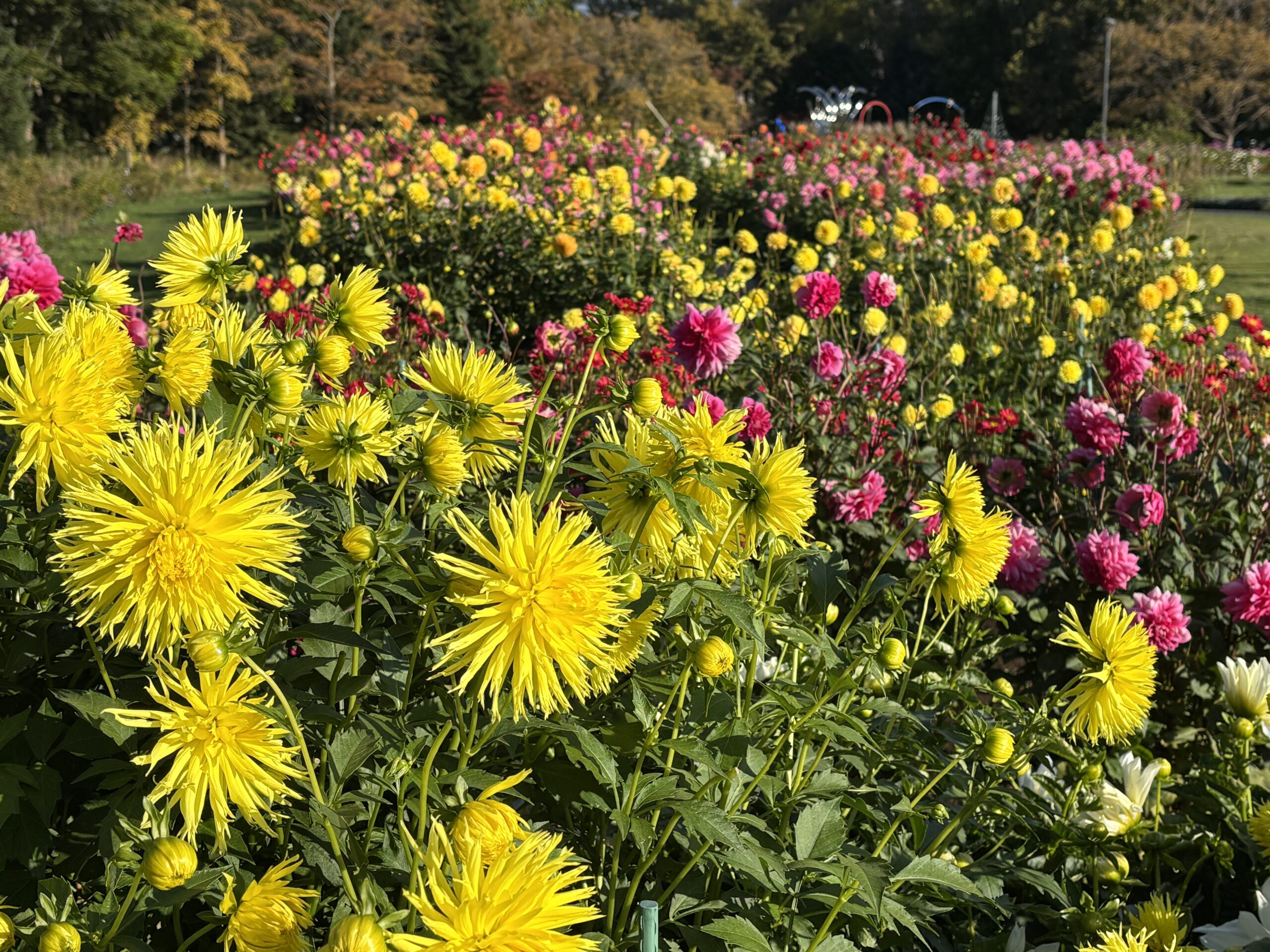 マフラーや手袋が恋しくなる季節を迎えつつありますが、百合が原公園の東側にあるダリア園では、彩り華やかな花々が咲き誇り、豪華な景色が広がっています。