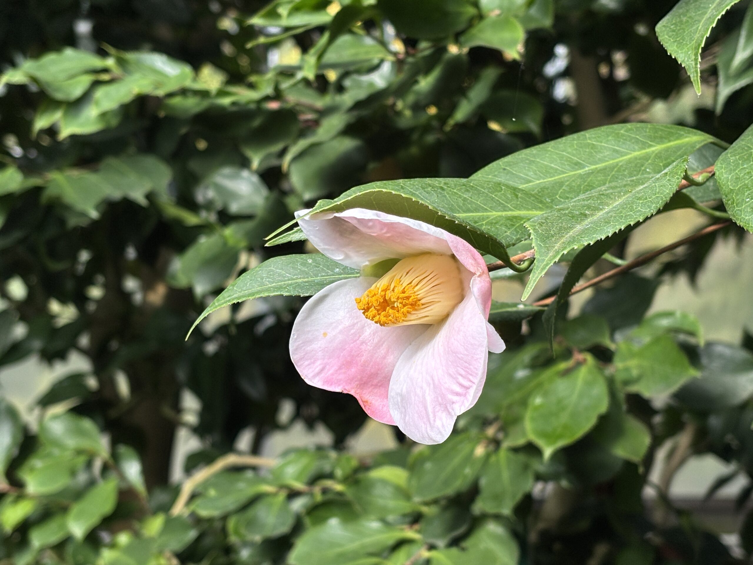 こちらは百合が原緑のセンター前の花壇。色づいたコキアを楽しめていますが、温室内では早咲きのツバキ ‘西王母(せいおうぼ)’ が咲き進んできています。