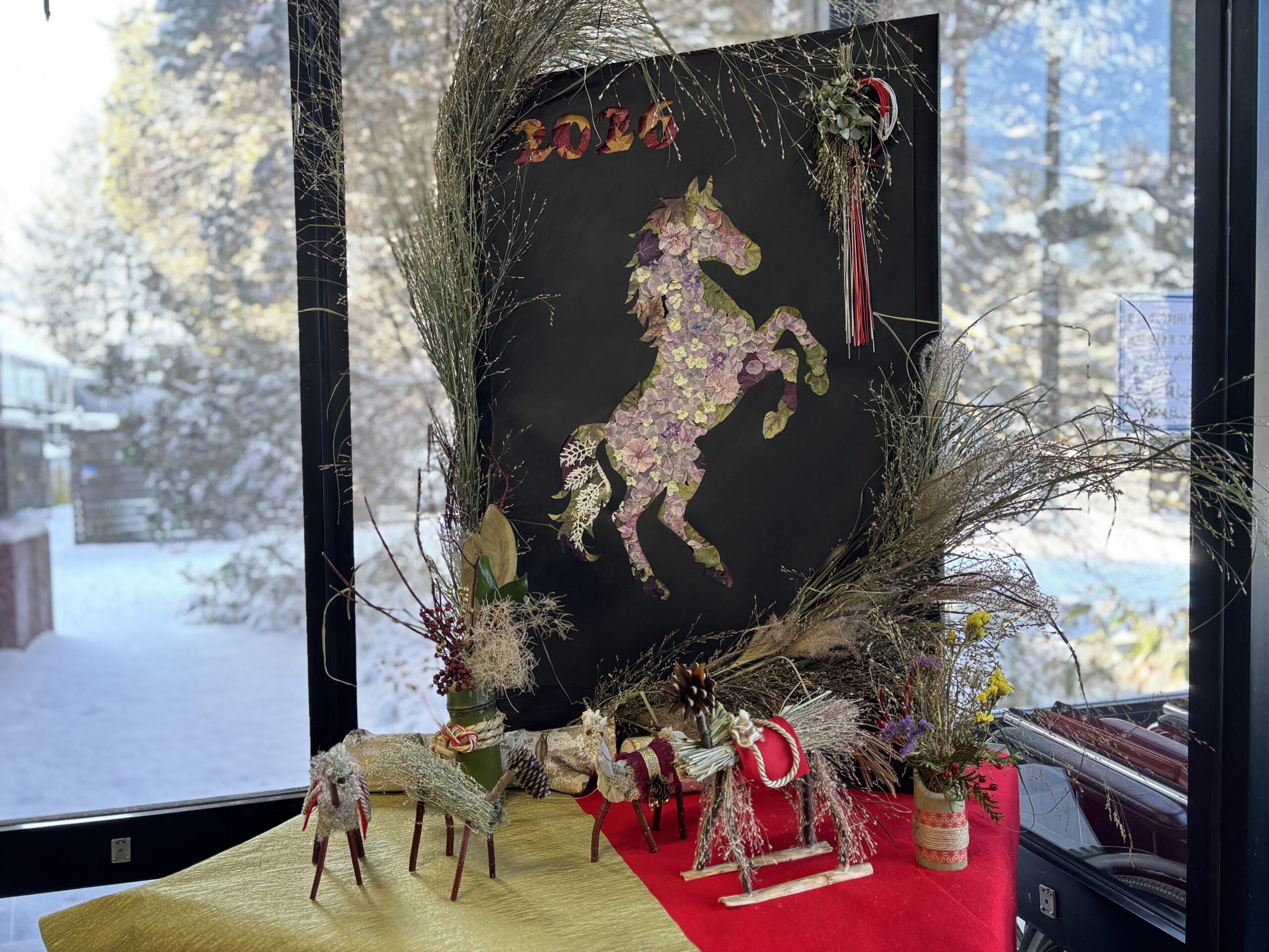 制作にご協力いただいたボランティアのみなさんは、躍動感あふれる「午」の切り絵部分にサトザクラやアジサイの押し花をあしらい、干支飾りを仕上げてくださいました。前方に配置された馬の人形は、胴体をグラス系の植物で、頭の部分には松ぼっくりやラムズイヤーを使って作り上げ、細部まで工夫が詰まった作品になっています。