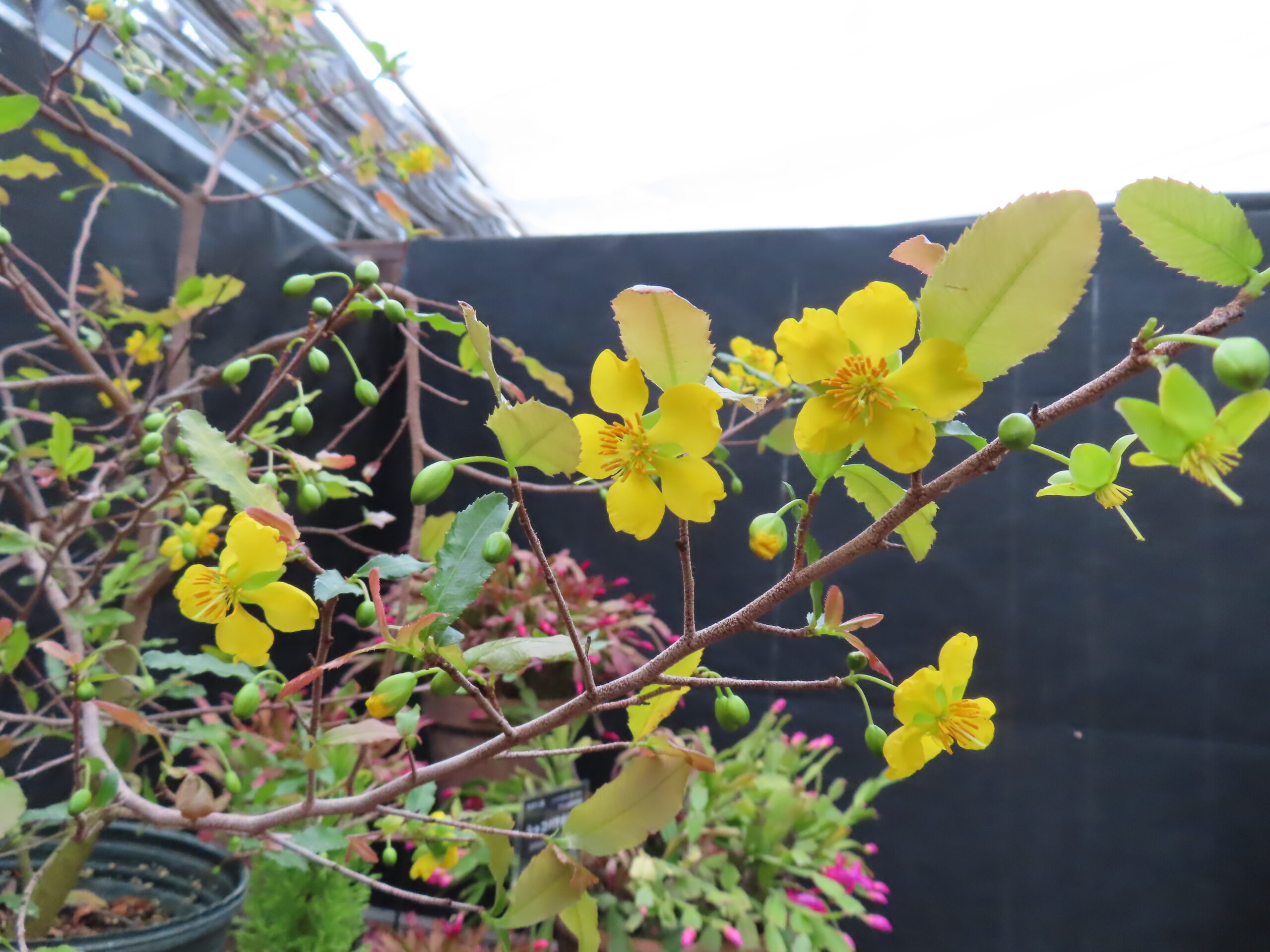 同じ中温室ではこんな黄色い花も咲いています。こちらは「ミッキーマウスの木」と呼ばれている、オクナ カーキー(オクナ科 オクナ属)。