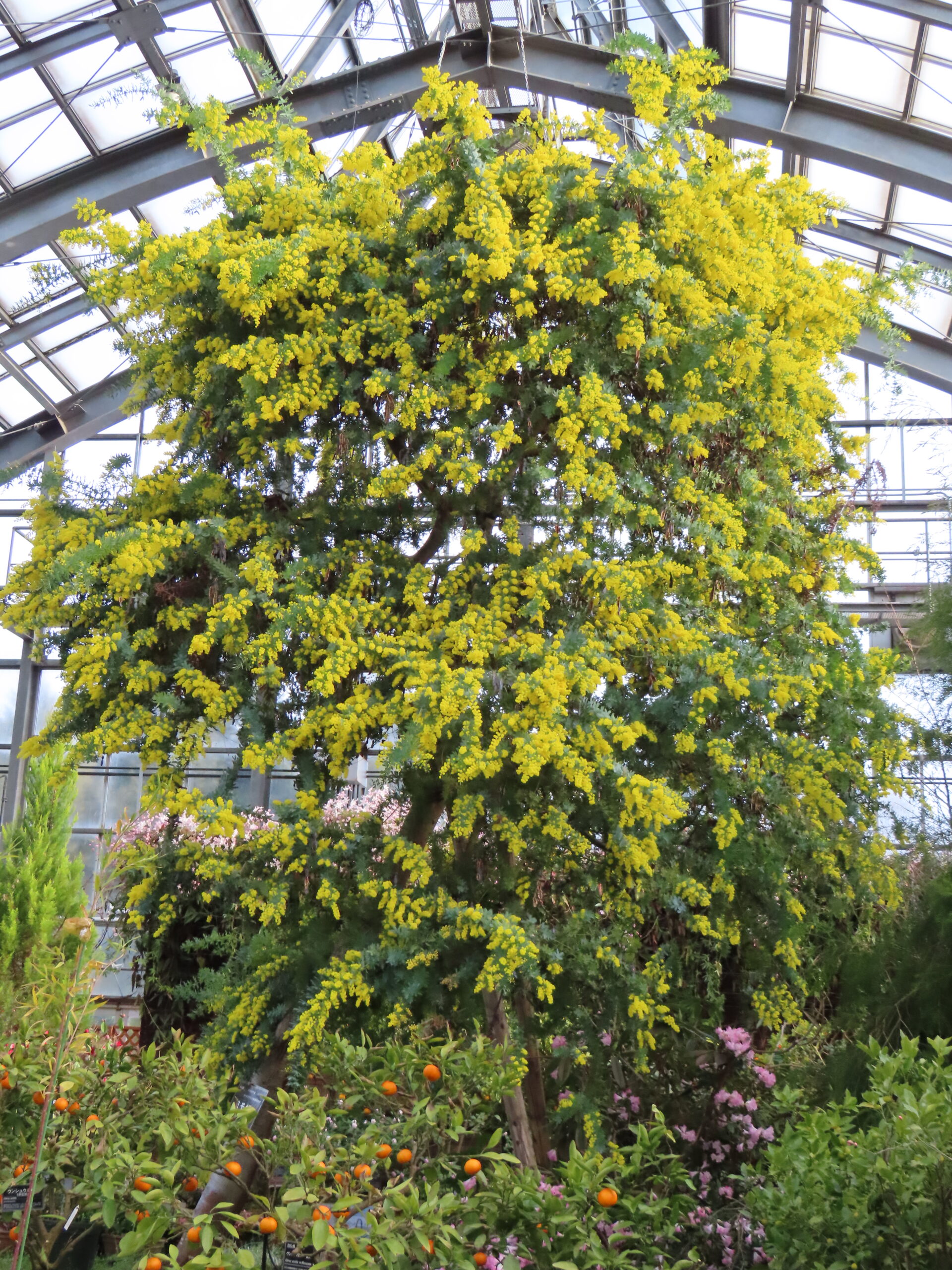 最近、「ミモザはまだ楽しめますか?」というお問い合わせが多くなってきています。昨年に比べて今年は開花が2週間ほど遅れて、2月13日に一部開花が確認された、百合が原 緑のセンターのミモザ。