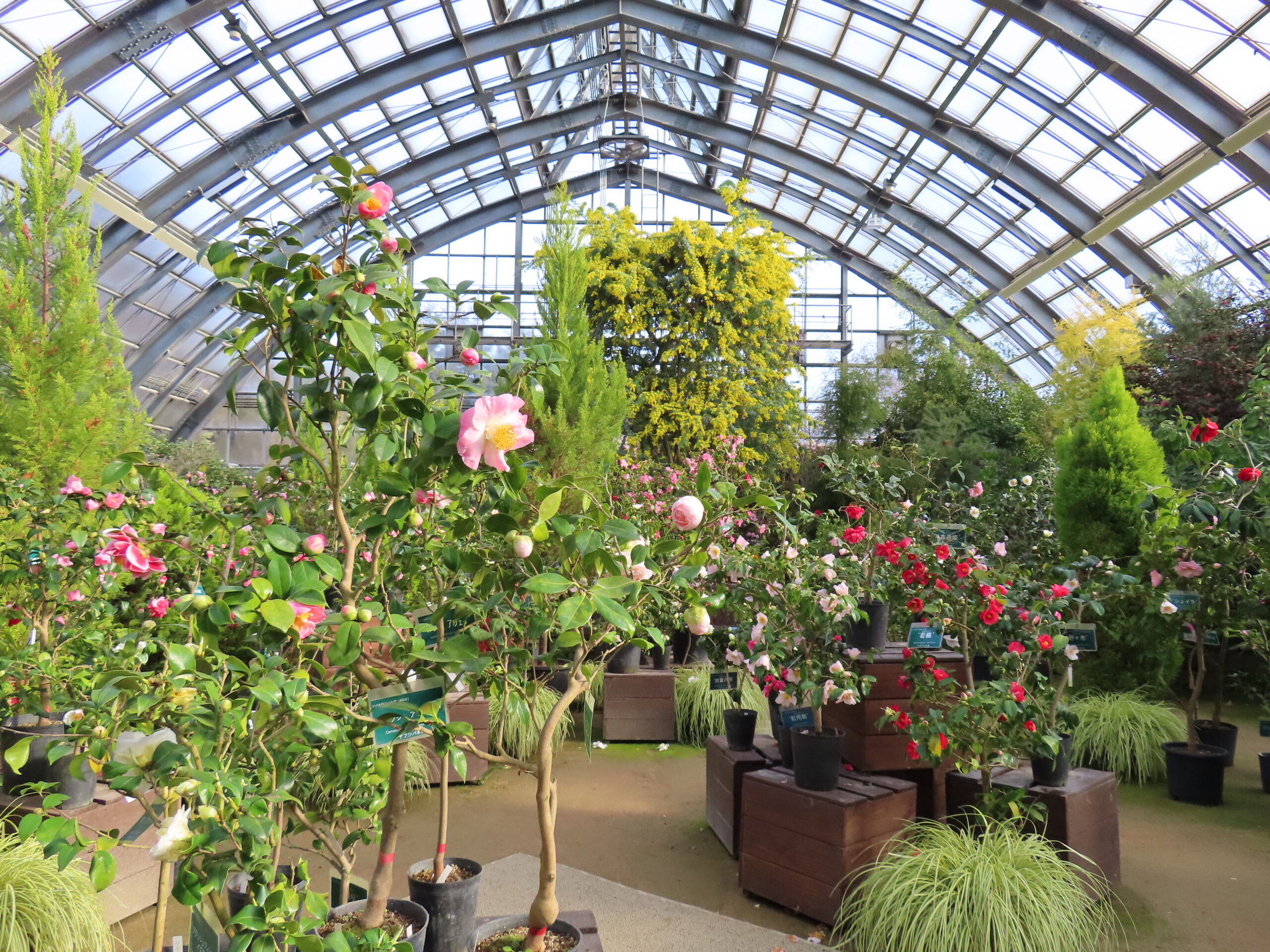 こちらの会場では、日本や海外で作出された花色や形が多彩なツバキに加え、趣ある原種ツバキも展示。