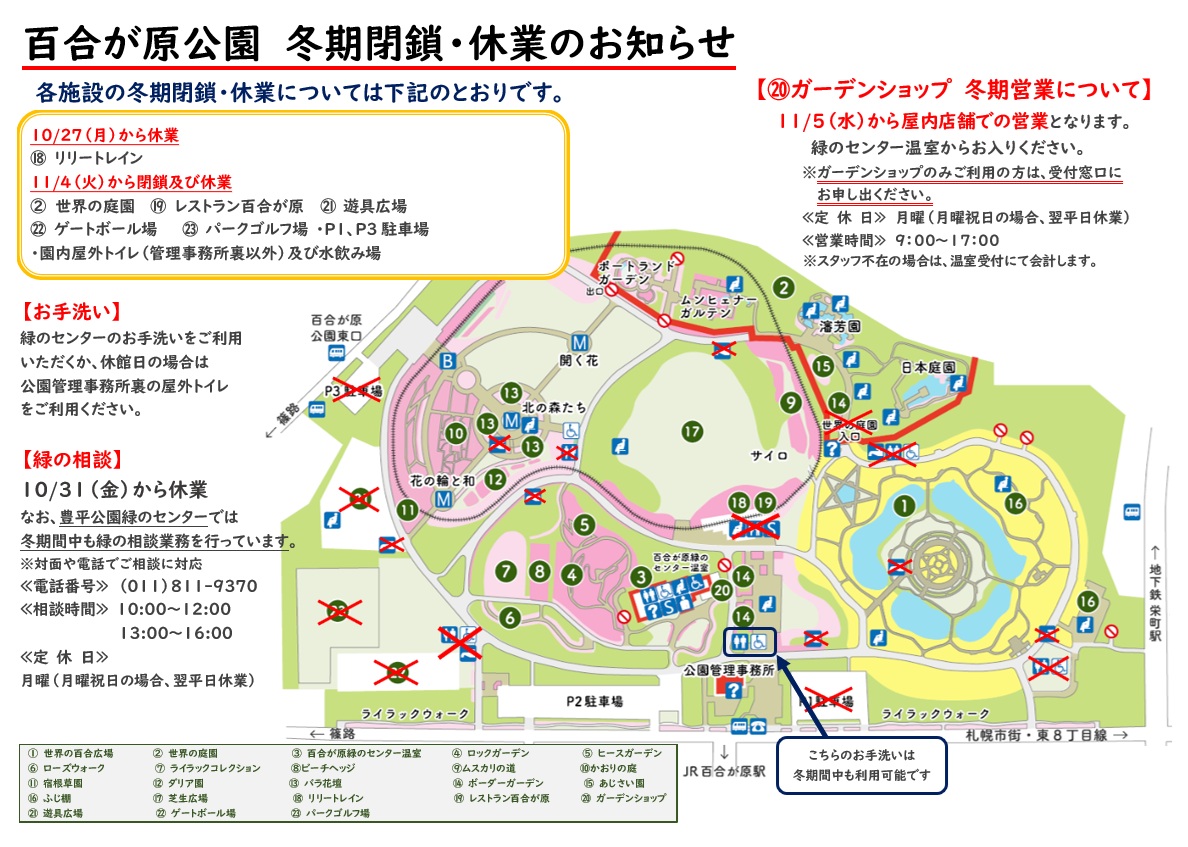 日頃より百合が原公園をご利用いただき、誠にありがとうございます。百合が原公園では、冬期間に入るため10月27日以降、閉鎖や業務が休業となる施設がございます。
