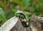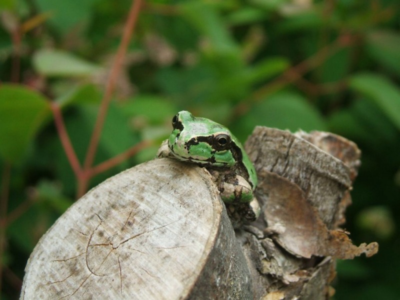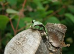 カツラの生け垣でまったり中のアマガエル。なんだかなごむ表情ですね。
