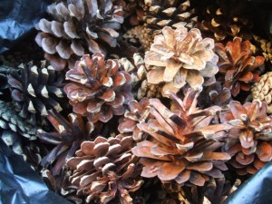 ボランティアさんにもお手伝い頂きつつ、現在、こうして松ぼっくりなど、こつこつと拾って集めています。