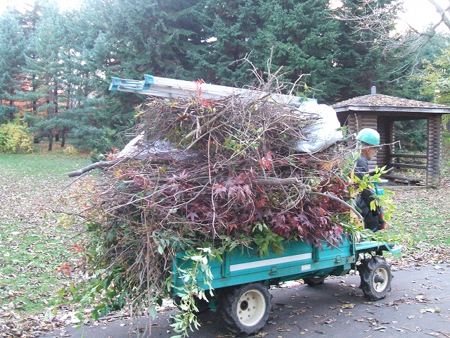 山積みの剪定枝が、リサイクル苗圃へ次々と運び出されていきます。