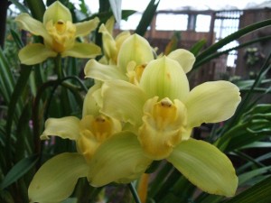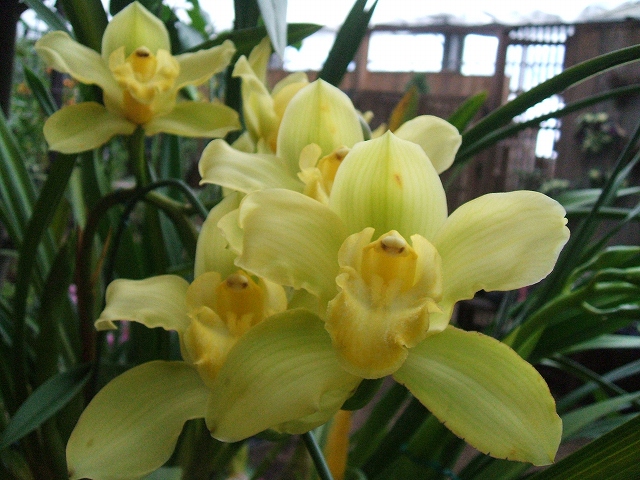 中温室では、冬に咲くラン、シンビジウムが咲いています。
