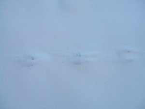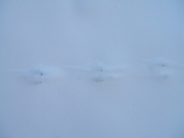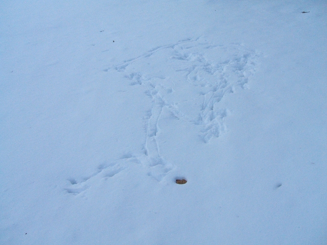 左は、ネズミか何か小動物のもの、右はおそらく鳥が雪をつつきながら歩きまわった跡のようです。