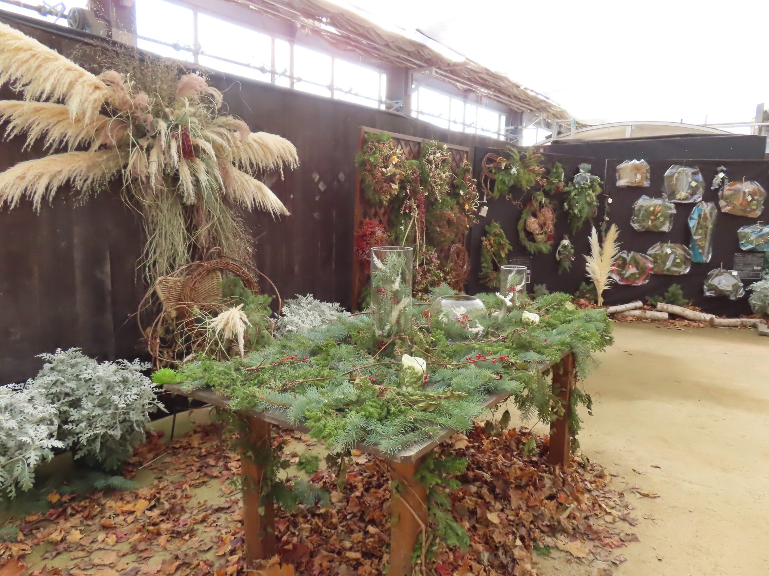 百合が原公園のボランティアのみなさんが制作してくださったクリスマスのリースやスワッグのほか、例年大人気の「松ぼっくりのツリーアレンジ」や