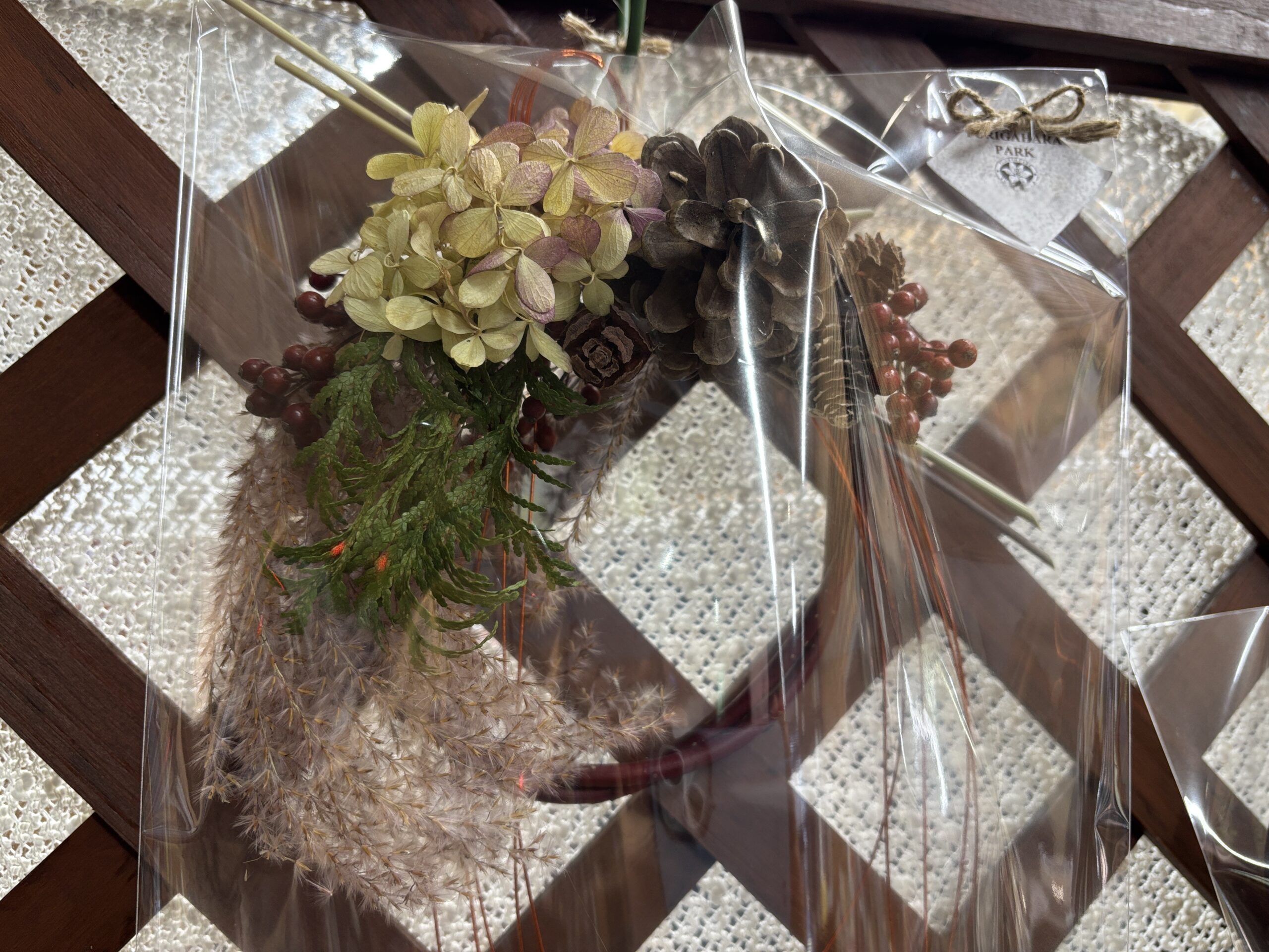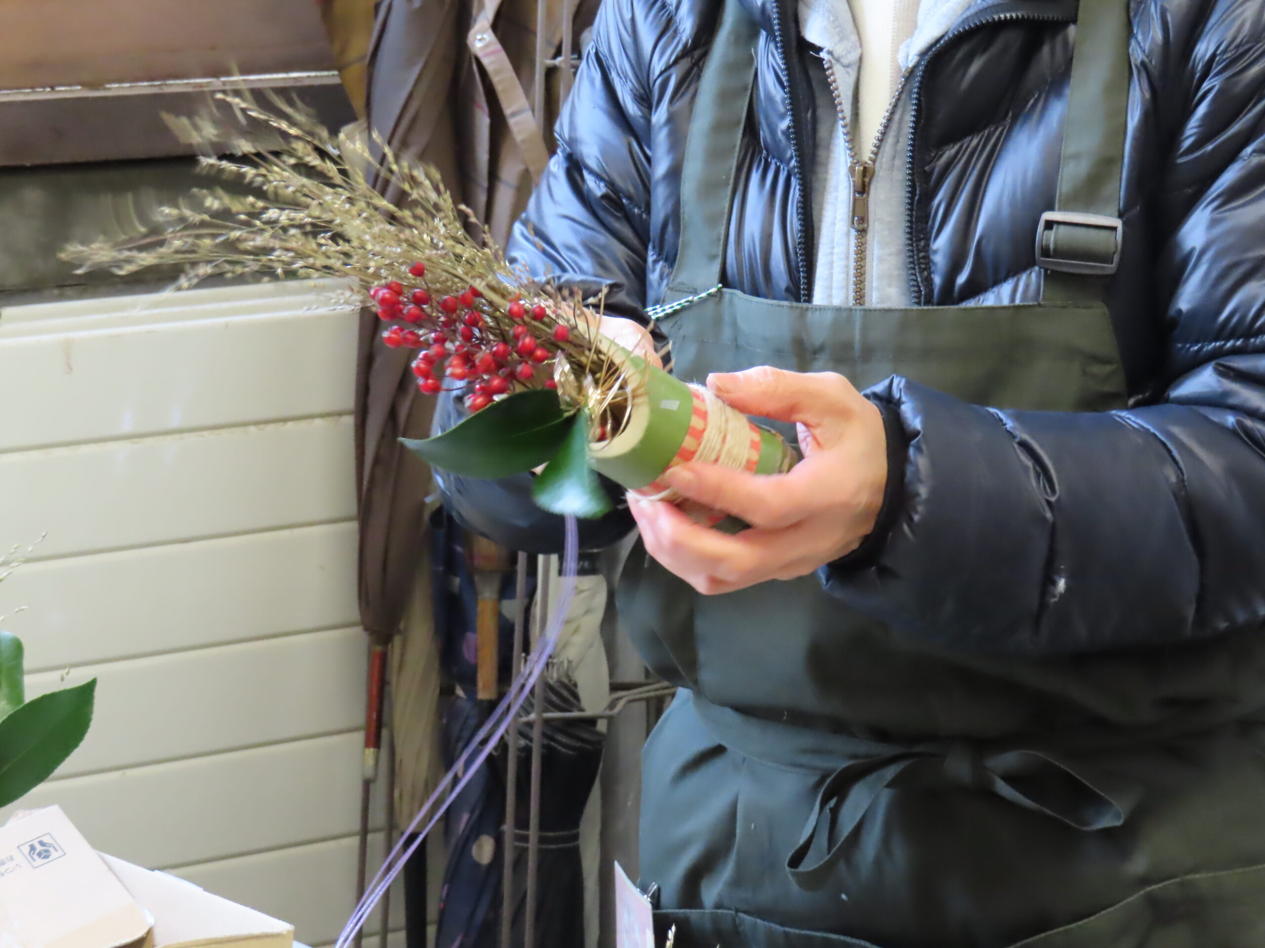針葉樹や木の実、グラス系の植物のほか、アジサイもあしらえて作られているこちらの正月飾りですが、クリスマスを前にたくさんの方々にお買い求めいただいています。
