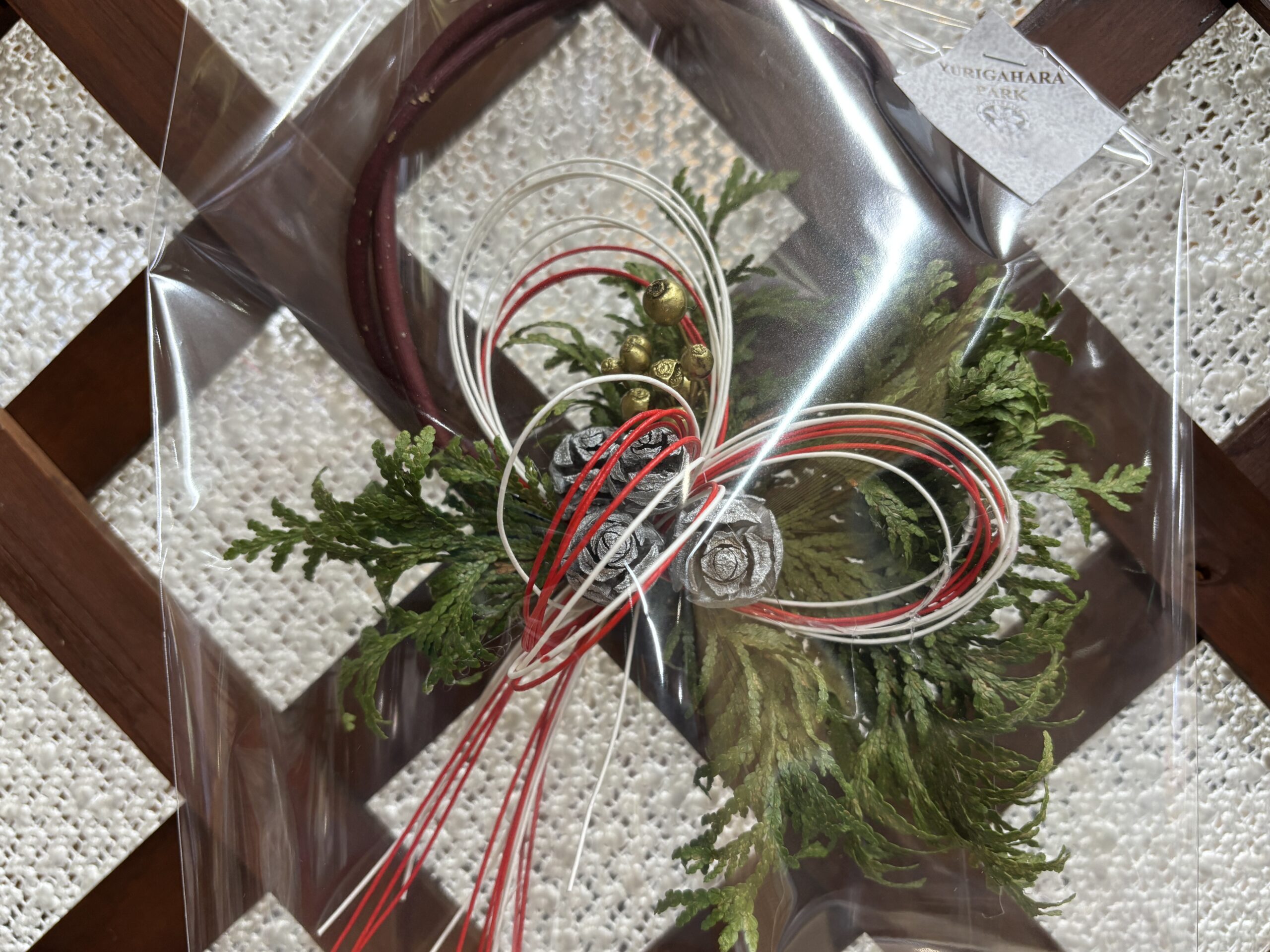 水引で作られた梅飾りもついた、縁起の良い正月飾りです。百合が原公園にお越しの際は、緑のセンターで販売中のクラフト製品もぜひご覧ください。